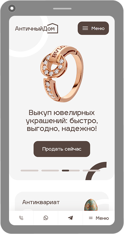 Реализовали имиджевый веб-ресурс для компании «Античный Дом», лидирующей на рынке скупки предметов роскоши в Москве. Перед нами стояла задача создать не просто витрину, а удобный инструмент оценки с высокой конверсией. Мы отказались от шаблонных решений в пользу кастомного дизайна с уникальной иллюстративной графикой и плавной анимацией. Воздушная верстка на белом фоне со светло-серыми акцентами подчеркивает статус клиента, а продуманная древовидная навигация позволяет пользователю мгновенно находить нужный раздел — от оценки швейцарских часов до выкупа брендовых сумок.