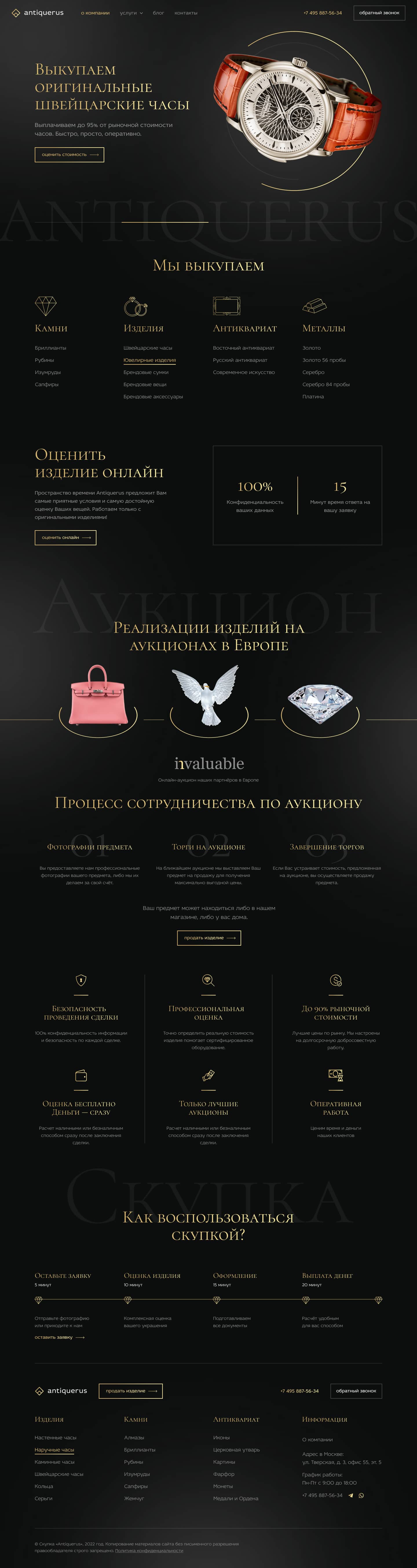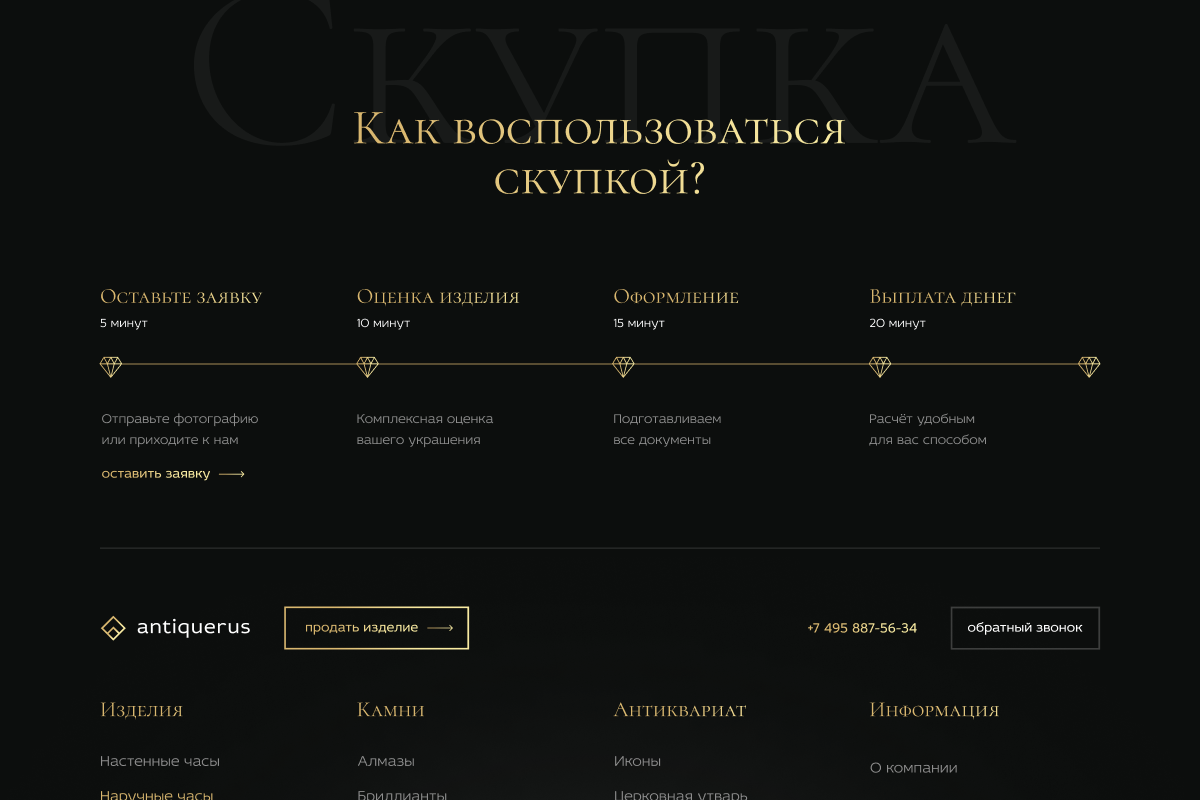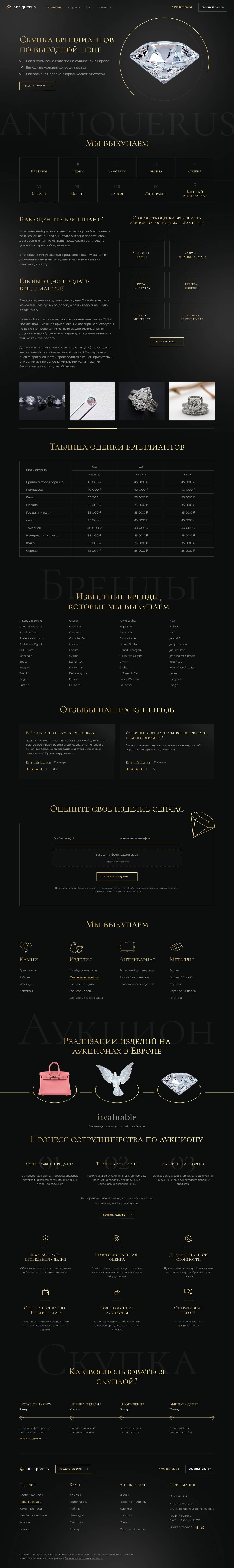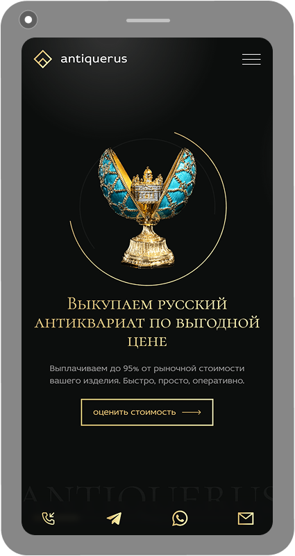 Студия TOP3 DIGITAL разработала для Antiquerus высококонверсионный сайт, решающий ключевую задачу рынка — трансформацию сложного экспертного процесса в удобный цифровой сервис. Мы спроектировали «древовидную» структуру навигации, позволяющую посетителю мгновенно находить интересующую категорию: от антиквариата до швейцарских часов.